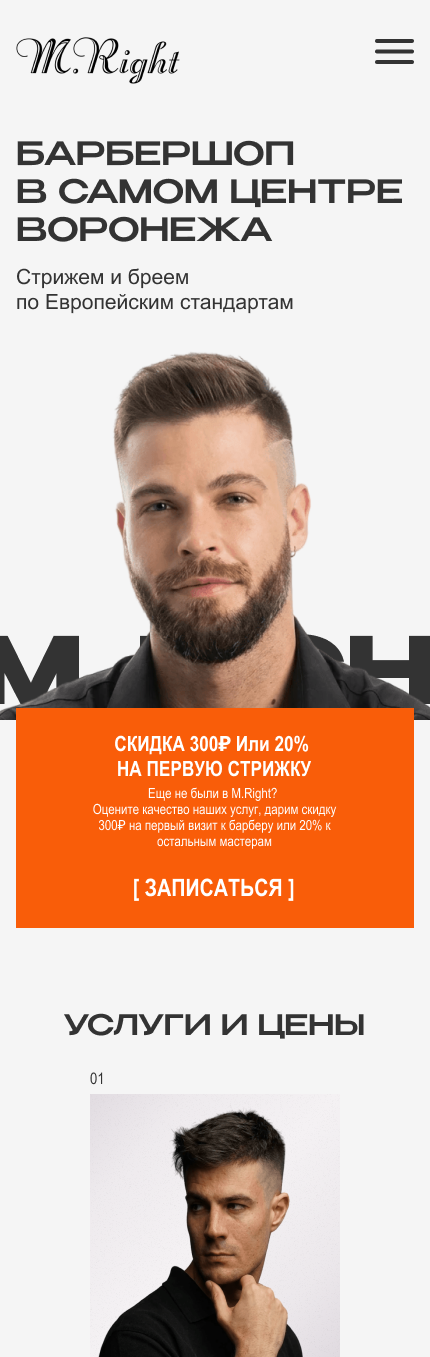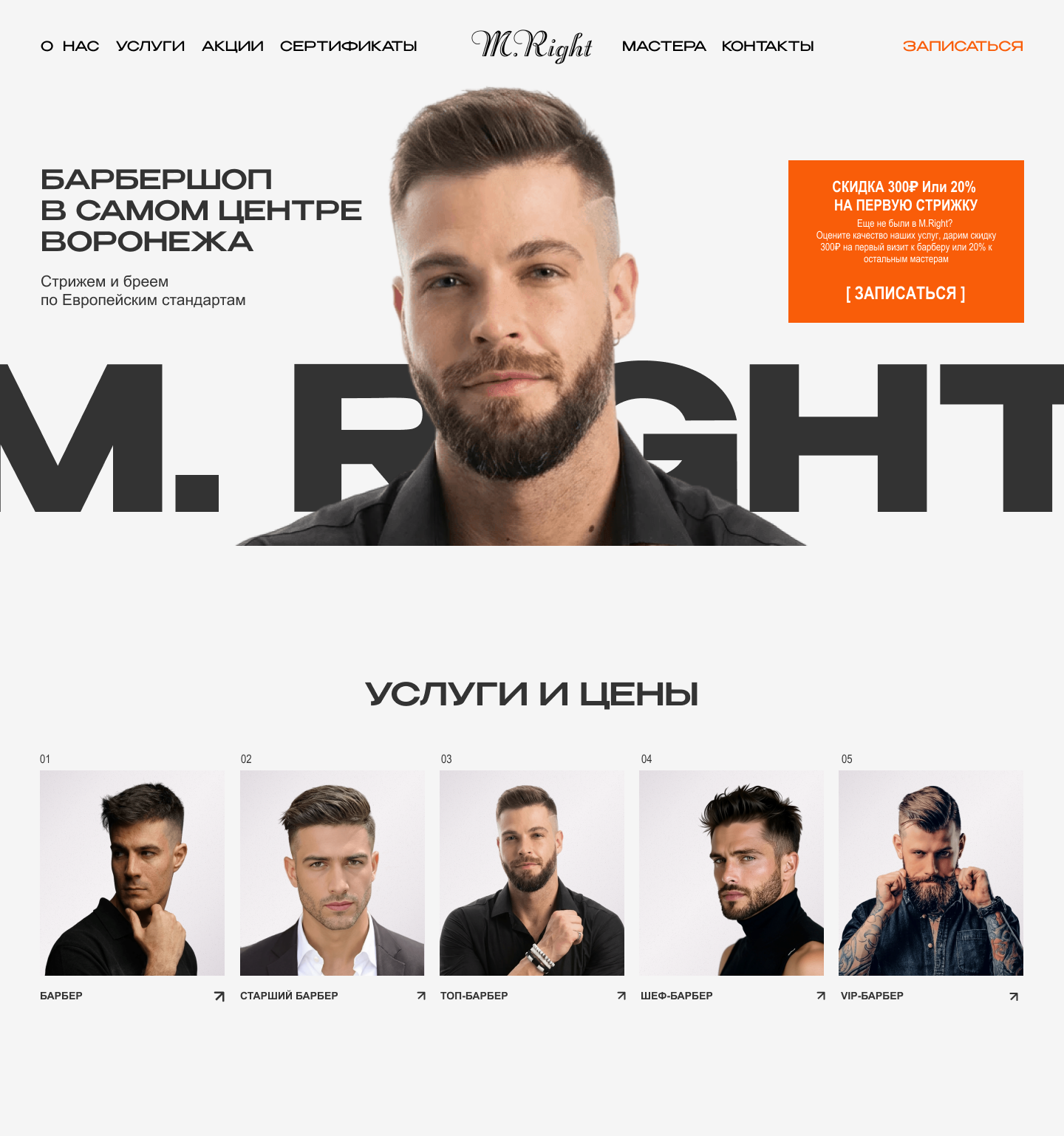 Создать современный и продающий лендинг для барбершопа M.Right в центре Воронежа, который подчеркнёт стиль бренда, повысит доверие клиентов и упростит онлайн-запись.